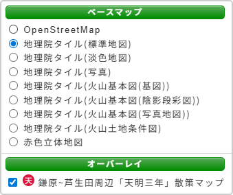マップ右上にある上記ボタンをタップすると下記パネルが表示され、ベースマップの切り替え及びオーバーレイのON/OFFを行うことができます。